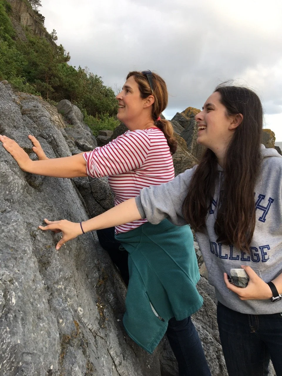 Pruss is a Professor of Geosciences at Smith College. In the image, she is examining an outcrop with her student Emma Roth (right).