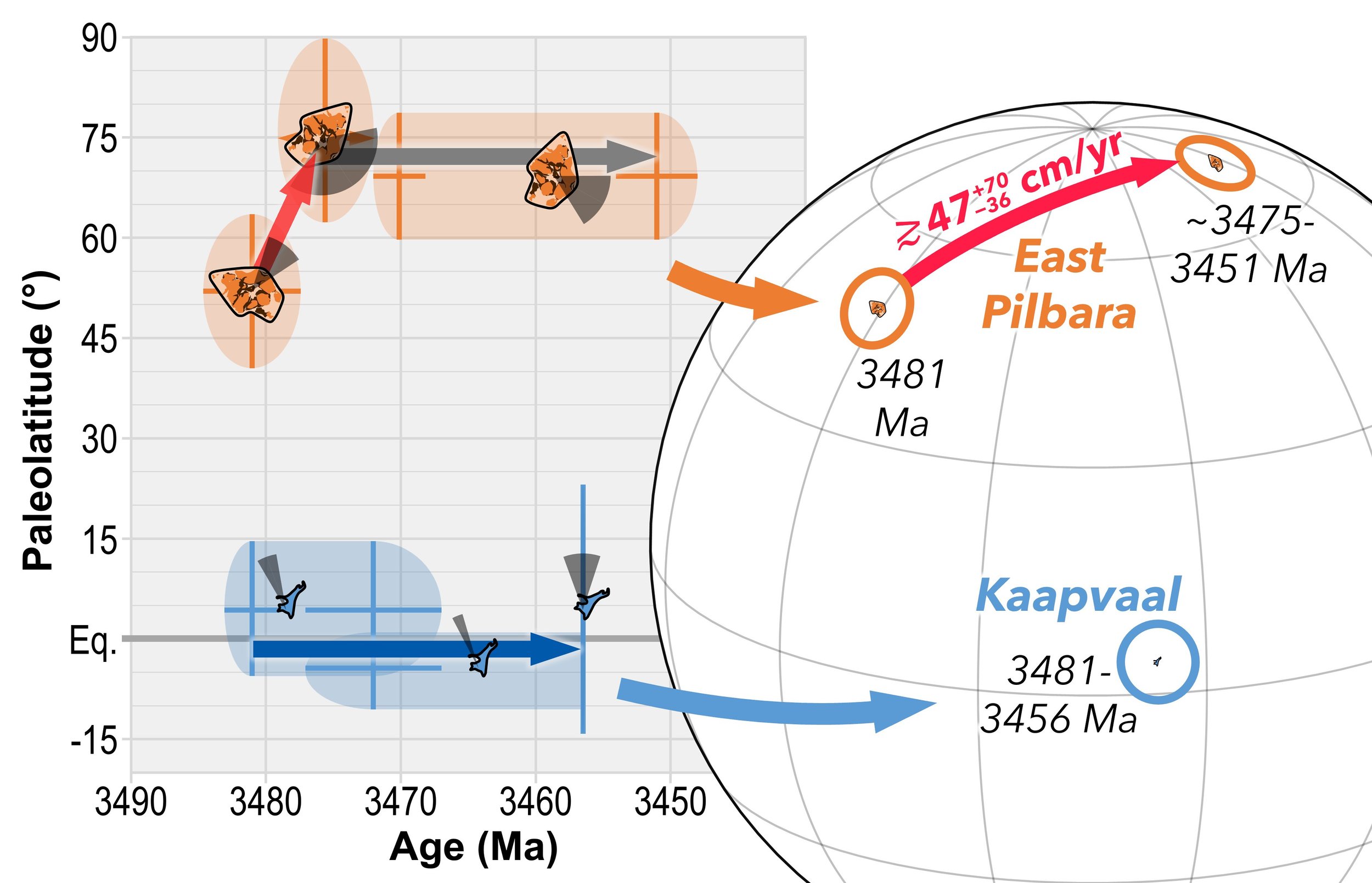 The paleomagnetic studies showed that between 3,481 million years ago (Ma) and ~3,475-3,451 Ma, the East Pilbara craton moved from a latitude of 53°N to about 77°N at a rate of 47 cm/yr, with an error of +70 cm/yr to -36 cm/yr. This is comparable to the fastest plate motions observed today. Over the same period, other workers have shown that the Kaapvaal craton in South Africa did not move in latitude. This is evidence that the two crustal blocks were moving independently of each other, with some kind of a boundary between them.