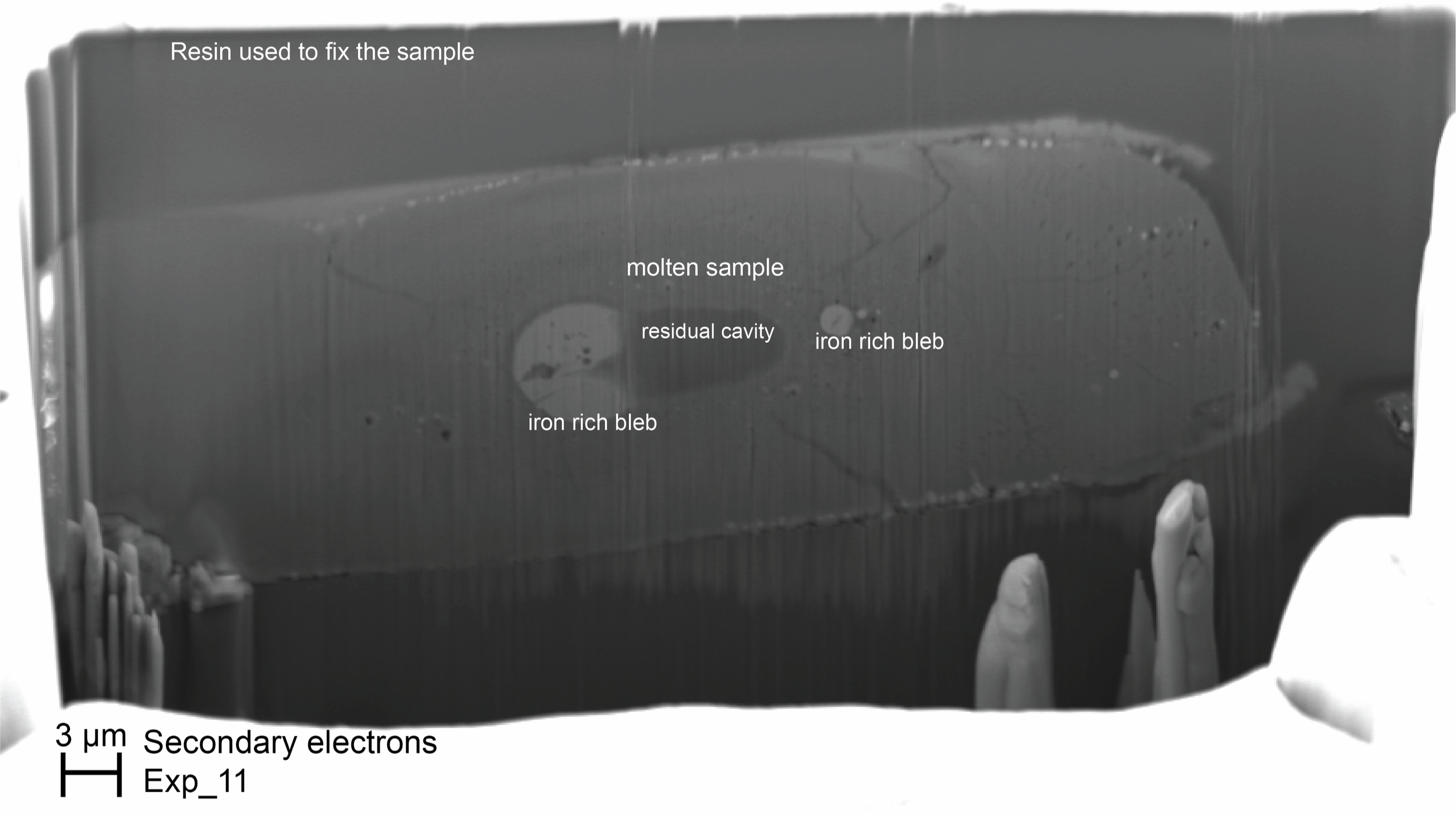 Electron microscope image of a sample after it was subjected to high temperature and pressure in the presence of hydrogen. The residual cavity is where water was created. The iron-rich bleb was formed when the iron oxide (FeO) was reduced by the hydrogen during the water-forming process, as shown in the next figure at left.