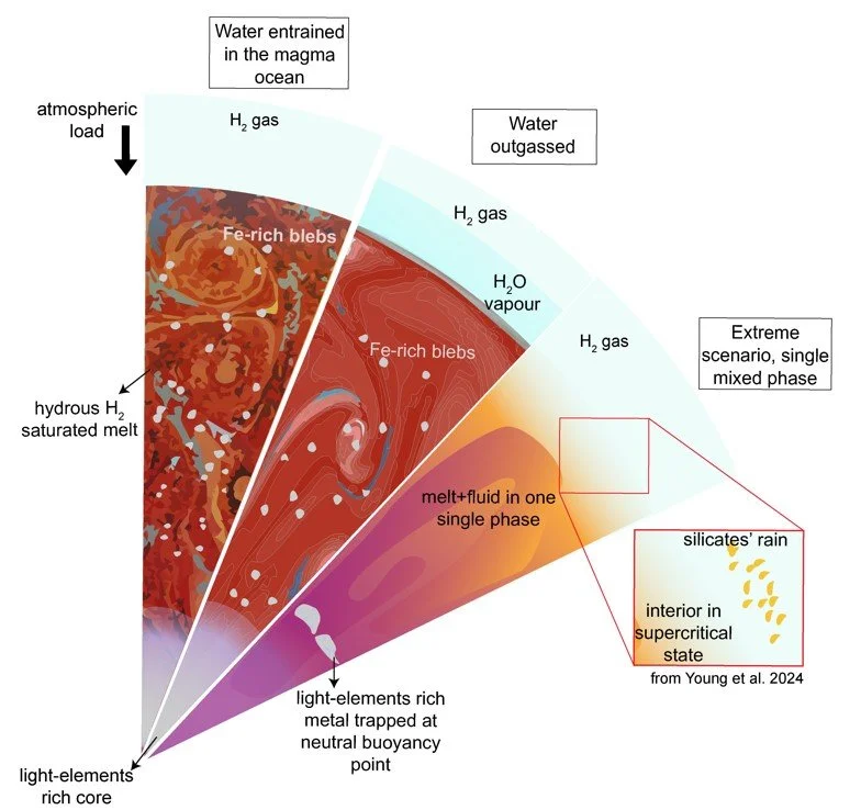 Conceptual illustration of three possible scenarios for interior–atmosphere interaction in big planetary bodies, often referred to as sub-Neptunes (between 1 and 17 Earth masses). Left: free fluid water and Fe-enriched blebs are entrained in the magma ocean. Centre: water is outgassed to create a steam atmosphere while the Fe-enriched blebs sink toward the centre. Right: extreme scenario in which all phases are miscible.