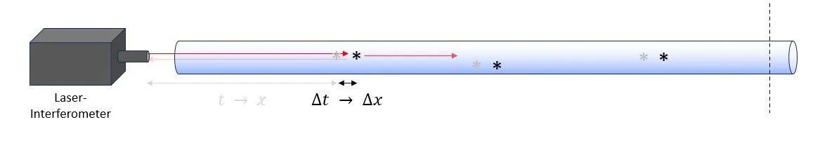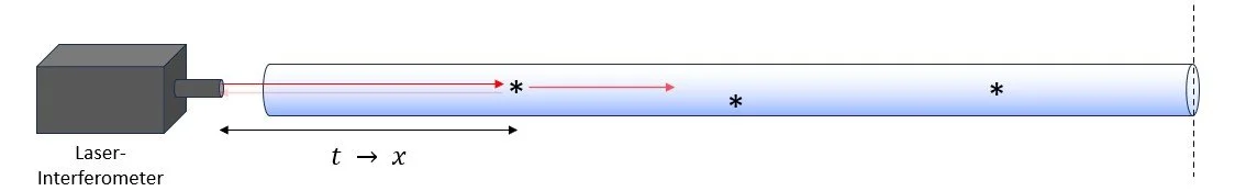 Fiber-optic cables include defects (*) that backscatter light passing along the cable. By measuring the round-trip travel time of light from the source to the defect and back using a laser interferometer, the distance to the defect can be calculated. When a seismic wave deforms the cable, there is a slight but detectable change in the travel time of the light to the defect, enabling the displacement caused by the seismic wave to be determined.
