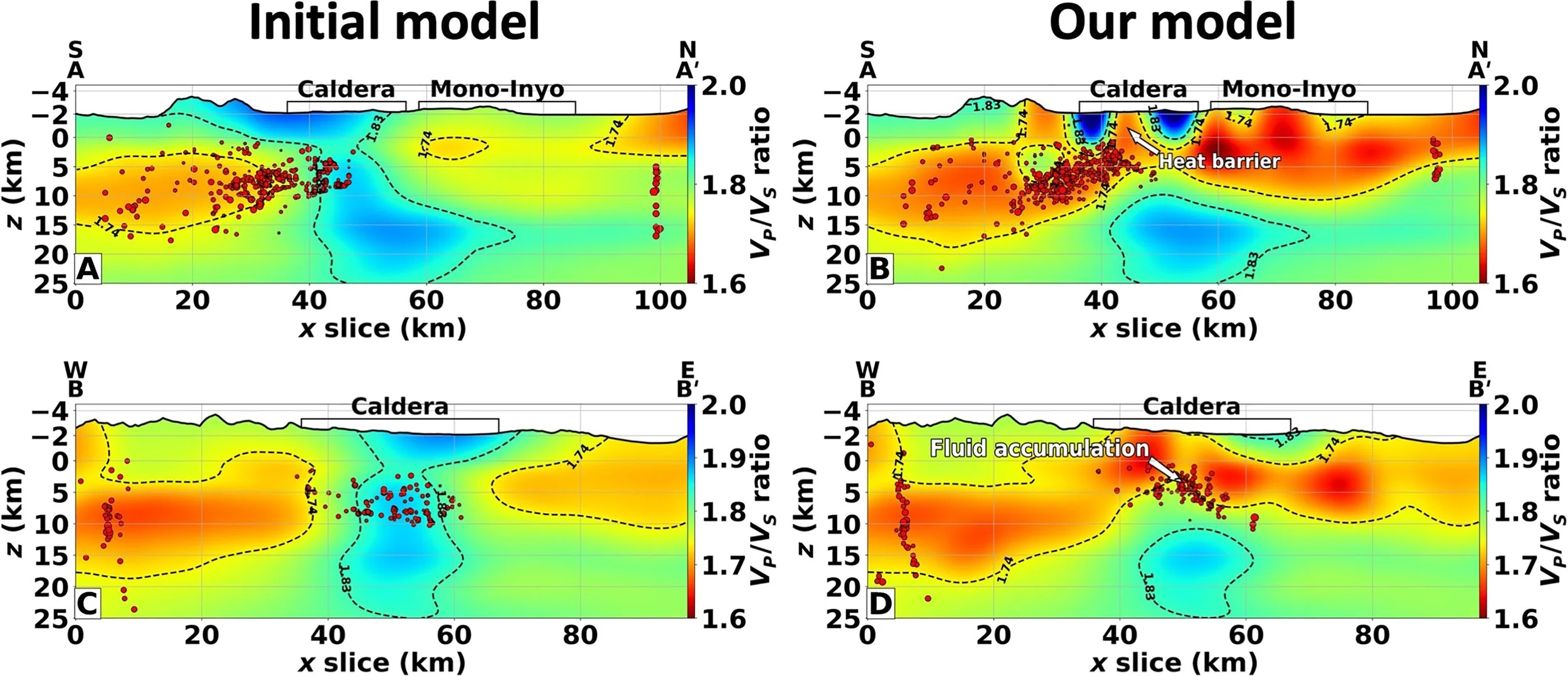 Sections showing the ratio of the P-wave velocities to the S-wave velocities along the sections AA’ and BB’ shown in the map above. The red dots indicate earthquakes occurring within 10 km of the cross sections. The fiber-optic-derived images highlight a definite separation between the shallow hydrothermal system and the large magma chamber located at ~12-kilometer depth. The combination of the geological evidence with these results enabled the researchers to determine the origin of the seismicity in the caldera. They concluded that fluids exsolved through second boiling provide the source of the observed uplift and seismicity.