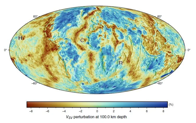 Horizontal slice at a depth of 100 km showing relative variations in the speed of vertically polarized S-waves (Vsv). The mid-oceanic ridges in the Atlantic and South Pacific show up prominently, as do hot-spot regions with active volcanism, such as Hawaii (H), Iceland (I), the Canaries (C), and La Réunion (R). The model also shows the contrast between the old, cold cratons and hot spots in Africa.