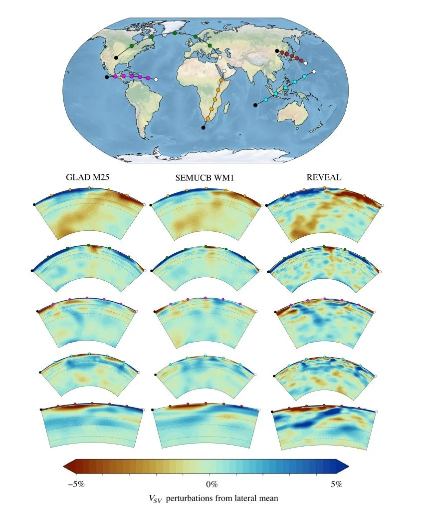 Comparison of cross sections of REVEAL with two earlier global tomographic models — GLAD M25 (Lei et al., 2020) and SEMUCB WM11 (French and Romanowicz, 2014). The geographical locations of the cross sections are indicated by the lines connecting colored dots on the globe, which correspond to the colored dots at the top of each section. The comparison shows how REVEAL produces sharper images, and hence cross sections than its predecessors. This enables us to place tighter spatial and temperature constraints on mantle features such as subducted slabs, the low-velocity region below east Africa, and (below) the Iceland plume.