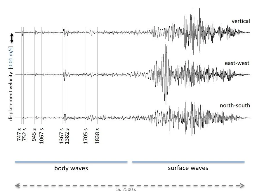 Seismic recording of S-waves (body waves) from the Tohoku earthquake that struck on March 11, 2011. The recording was made at the Black Forest Observatory in Germany, 83.3 degrees of latitude west of the earthquake epicenter. The body waves arrive first as they travel faster than the surface waves.