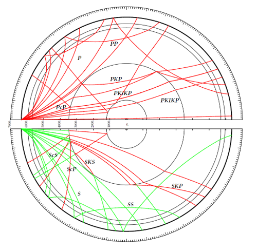 Each wave travels along a different path through the Earth and therefore “sees” a different part of the Earth. The diagram shows a section of the Earth with the simulated earthquake at left. The illustrative P-waves are shown in red and S-waves in green. The ray-path designations describe the wave type and its journey through different layers. P = primary wave; S = secondary wave; K = P-wave that travels through the earth’s outer core; c = reflection from the core-mantle boundary. Thus, for example, an ScP designation refers to an S-wave traveling toward the center of the Earth, reflecting off the outer core, and converting to a P-wave that travels upward. For illustrative purposes, S-waves propagating from the simulated earthquake are shown in the top hemisphere, and P-waves are shown in the bottom hemisphere (though some of them are then converted into S-waves).