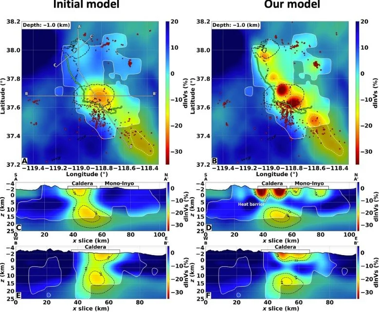A fiber-optic cable was used to record earthquakes and seismic signals with much higher temporal and spatial resolution than was previously possible. Here, two fiber-optic cables covering an approximately 100-km north-south transect across the Long Valley Caldera in California. The panels on the left display S-wave anomalies from the initial model derived from the seismic-station data, while the panels on the right show the S-wave velocity anomalies obtained using the fiber-optic-cable data. The depth of the slices in the top panels is 1 km. The caldera and the extent of the lakes are shown by the black dashed lines. The panels in the 2nd and 3rd rows show model cross sections along the lines AA’ and BB’ indicated in the map shown above. The fiber-optic-based model shows a clear improvement in resolution as compared to the initial model.