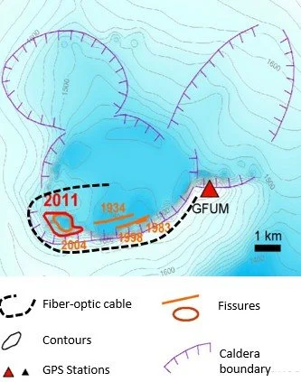 Fiber-optic data obtained during an eruption of Grimsvöten. This revealed about 1,000 small earthquakes a week, about 100 times more than the regional seismometer network was able to detect. This enabled the dynamics of the eruption to be monitored with much higher spatial resolution than was previously possible.