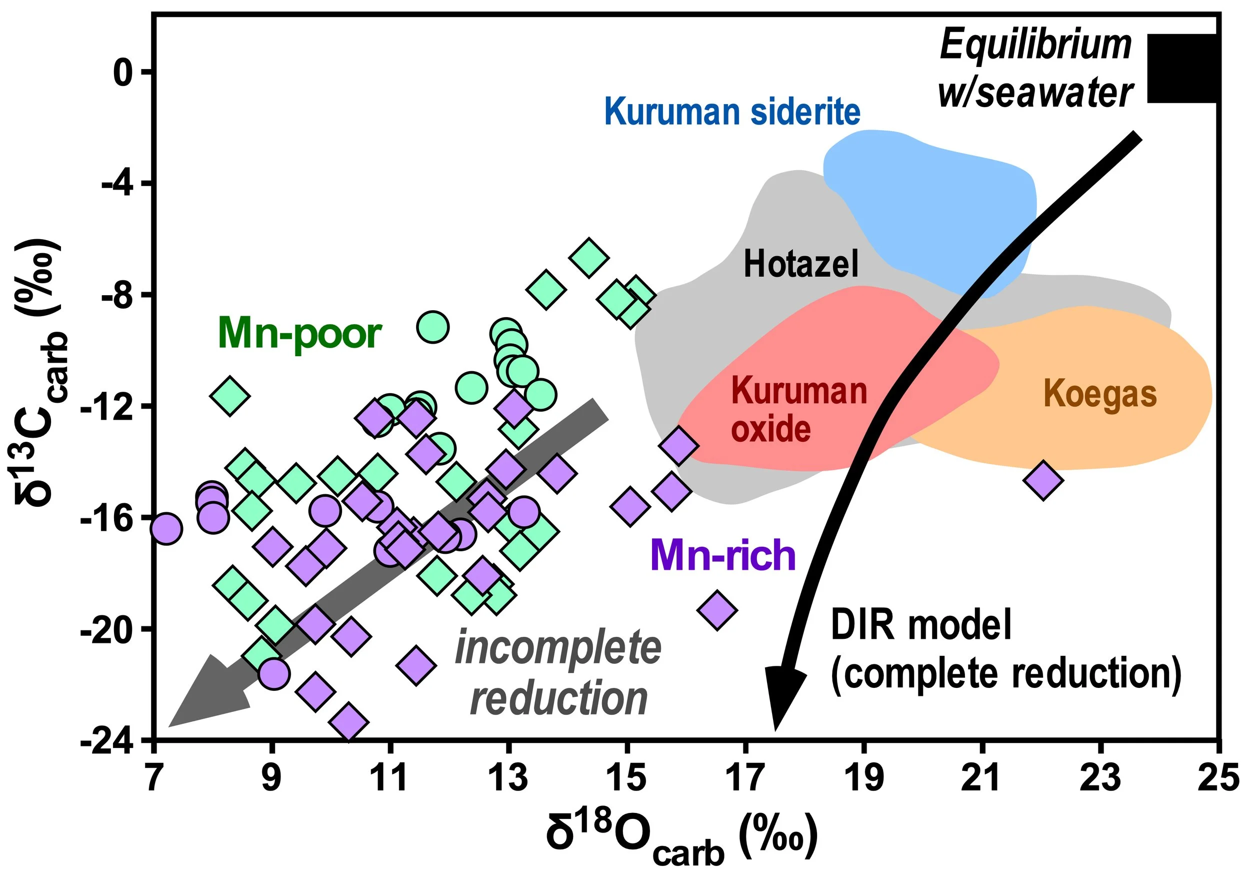 <CAPTION TO BE EDITED> Carbon and oxygen isotope relations for BIF carbonates (siderite and other iron-rich carbonates) for ~2.5 Ga BIFs (colored fields) and 2.9 Ga BIFs (Symbols). Black curve is trend for microbial Fe3+ reduction (Dissimilatory Iron Reduction; "DIR"), run to completion (requiring a mixture of organic carbon and seawater carbonate) and grey arrow is trend for incomplete DIR (minimal seawater carbonate contribution). In all cases, none of the C and O isotope compositions are in equilibrium with seawater, and this is confirmed by Sr isotope studies. These relations provide powerful evidence that microbial iron reduction is responsible for producing the iron carbonates in BIFs. Figure from Johnson et al. (2020) Iron Geochemistry: An Isotopic Perspective, Springer, 360 p.