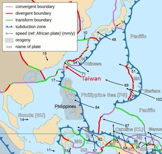 Map showing the complex tectonic setting of Taiwan. The region experiences frequent large earthquakes and high uplift rates.