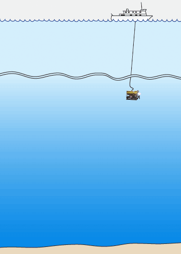 Cartoon (not to scale) of the research vessel Western Flyer at the surface, the ROV Doc Ricketts near the seafloor, and the two types of flow that affected the ROV in Mendocino Canyon.