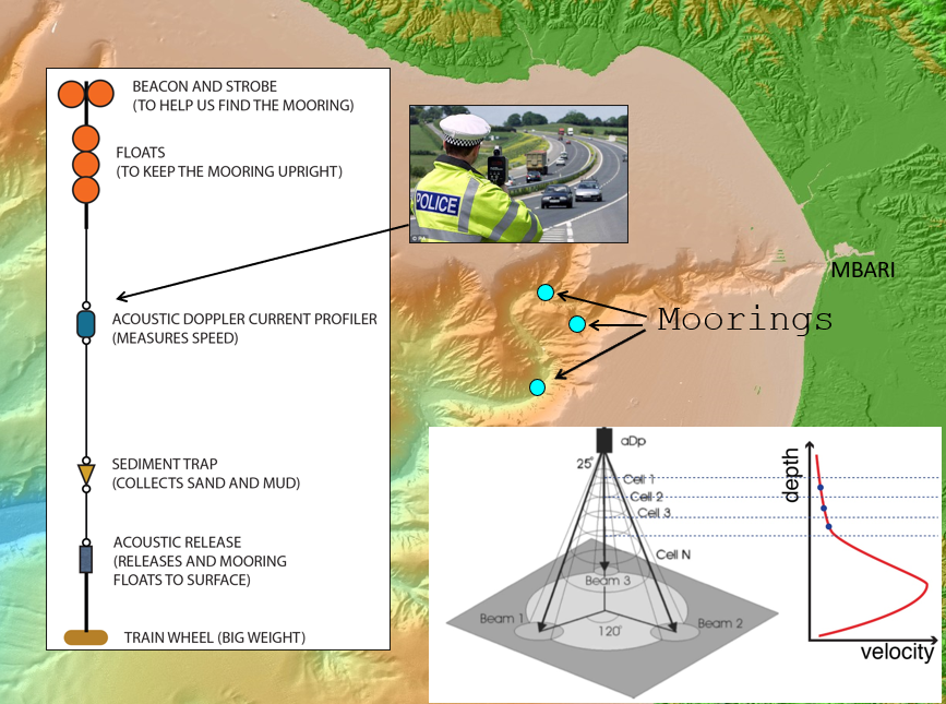 Sumner and her team used acoustic doppler current profilers to measure the velocity profile of the water flow in Monterey Canyon. As indicated in the inset at bottom left, the instrument directs beams of high-frequency sound toward the seafloor and looks for the reflections coming from different depths. The use of three dispersed beacons allows for the flow direction as well as its speed to be measured. We can deduce flow velocities from the shifts in frequency of these reflections. The results, plotted at bottom right, show the velocity profile peaking at up to 8 m/s.