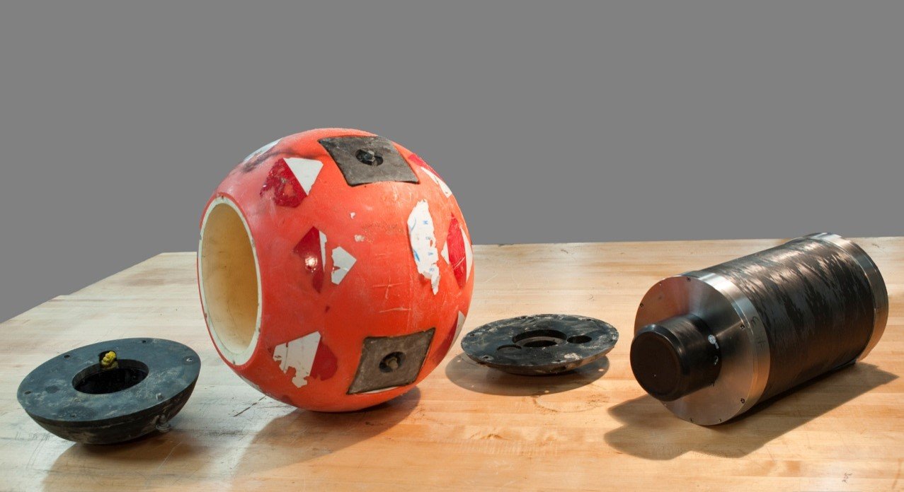 Smart boulders contain accelerometers and depth (pressure) sensors. They also have acoustic modems, enabling them to transmit data, even through over a meter of sediment. The data is picked up by a wave glider (right).