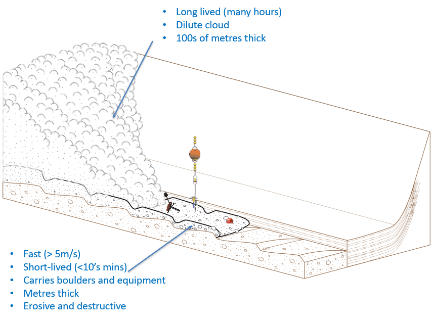 Diagram of a turbidity current showing two main components: a fast, short-lived destructive base flow and a long-lived, dilute cloud that rides above the base flow. The base flow can sweep boulders and experimental equipment along with it.