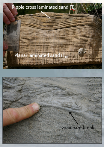 Turbidite outcrops showing various typical structures. Top left: two of the five Bouma divisions: planar laminated sand and ripple cross-laminated sand. Bottom left: grain-size break within a single turbidity current. Below the break is structureless sand, above the grain-size break is convolute lamination (a type of dewatering structure). As Sumner mentions in the podcast, it is quite rare to see the textbook Bouma sequence in the field.