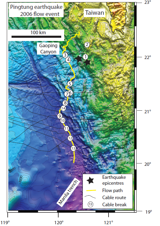 Location of cables south of Taiwan broken by submarine flow triggered by the Pingtung earthquakes in 2006. Two epicentres are shown by black stars. Turbidity currents were triggered by the earthquake, the largest one traveling down the Gaoping canyon, progressively rupturing cables (numbered circles). As Sumner describes in the podcast, the timing of the rupture of the fiber-optic cables provides a way of measuring the movement of the turbidity currents triggered by the earthquake. Speeds of 13 m/s were inferred in the mid-canyon region and 6 m/s at the Manila trench.