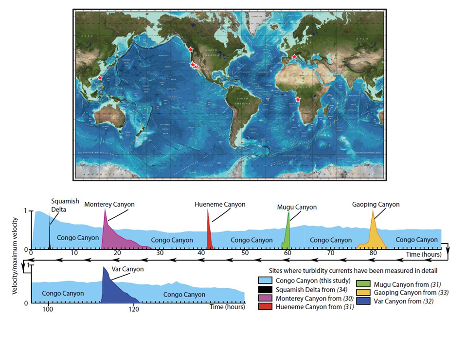 Plot showing relative durations of various turbidity currents at the locations marked with red stars in the map above. The turbidity currents of the Congo Canyon are far more prolonged than any other monitored oceanic turbidity currents. In the podcast, Sumner talks about how some flows reach steady state, maintain constant velocity, and stretch out over time — and she specifically names Congo Canyon as the place where turbidity currents are being monitored for much, much longer durations, i.e., days or even in excess of weeks.
