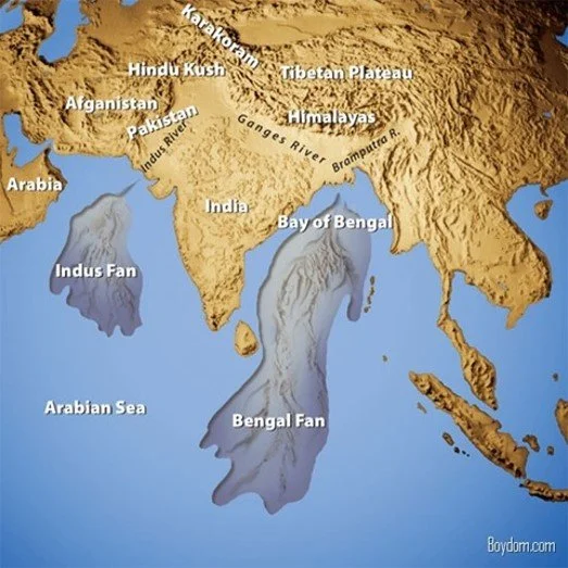 When the submarine canyons reach the deep sea, the sediment they carry can be deposited as submarine fans. These are some of the largest sediment accumulations on Earth. In the podcast, Sumner explains that the Bengal fan is composed of sediments from many millions of years of erosion of the Himalayas.