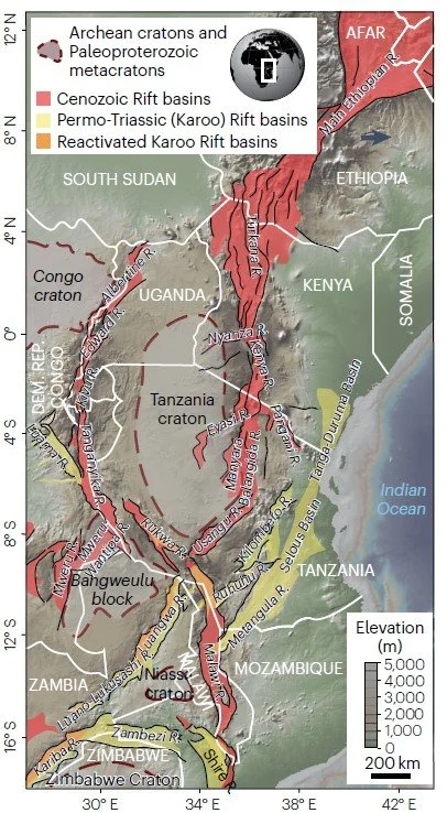 Locations of active continental rifts with their extension velocities. In the podcast, Kolawole focuses on the East African rifting that extends from the northeast corner of the continent down to Malawi and Botswana. Kolawole explains why he thinks the rift, though only in its early phase today, will continue to stretch and eventually lead to a full continental breakup.