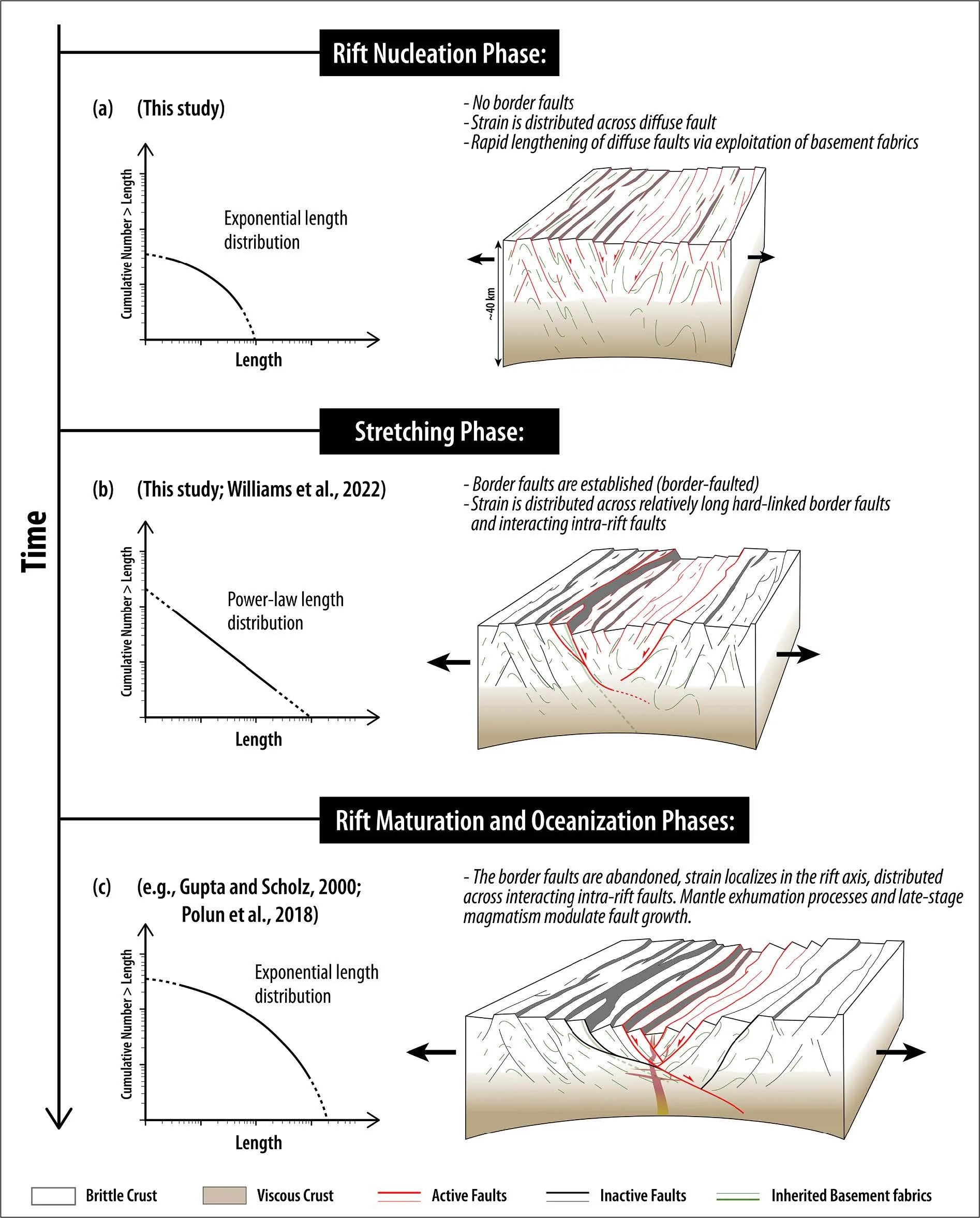 Cartoons illustrating the early phases of continental rifting described in the podcast. (a) Rift nucleation phase: diffuse faulting with faults lengthening as they exploit weaknesses in the crust. This results in the exponential distribution of fault lengths shown in the plot. Note, the plot is on a log-log scale. (b) Stretching phase, during which border faults are established and strain is distributed across the intra-rift faults and large border faults. (c) The maturation phases of rifting during which strain migrates to the rift axis. The faults become linked and lengthen.