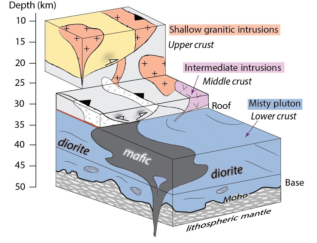 Block diagram showing the internal components of the Misty pluton, which is one of the plutons of the Southern Fiordland batholith. A conduit rising through the lithospheric mantle feeds a sheet-like basalt structure, which in turn connects to steep-sided granitic bodies in the middle and upper crust (colored in mauve and pink).