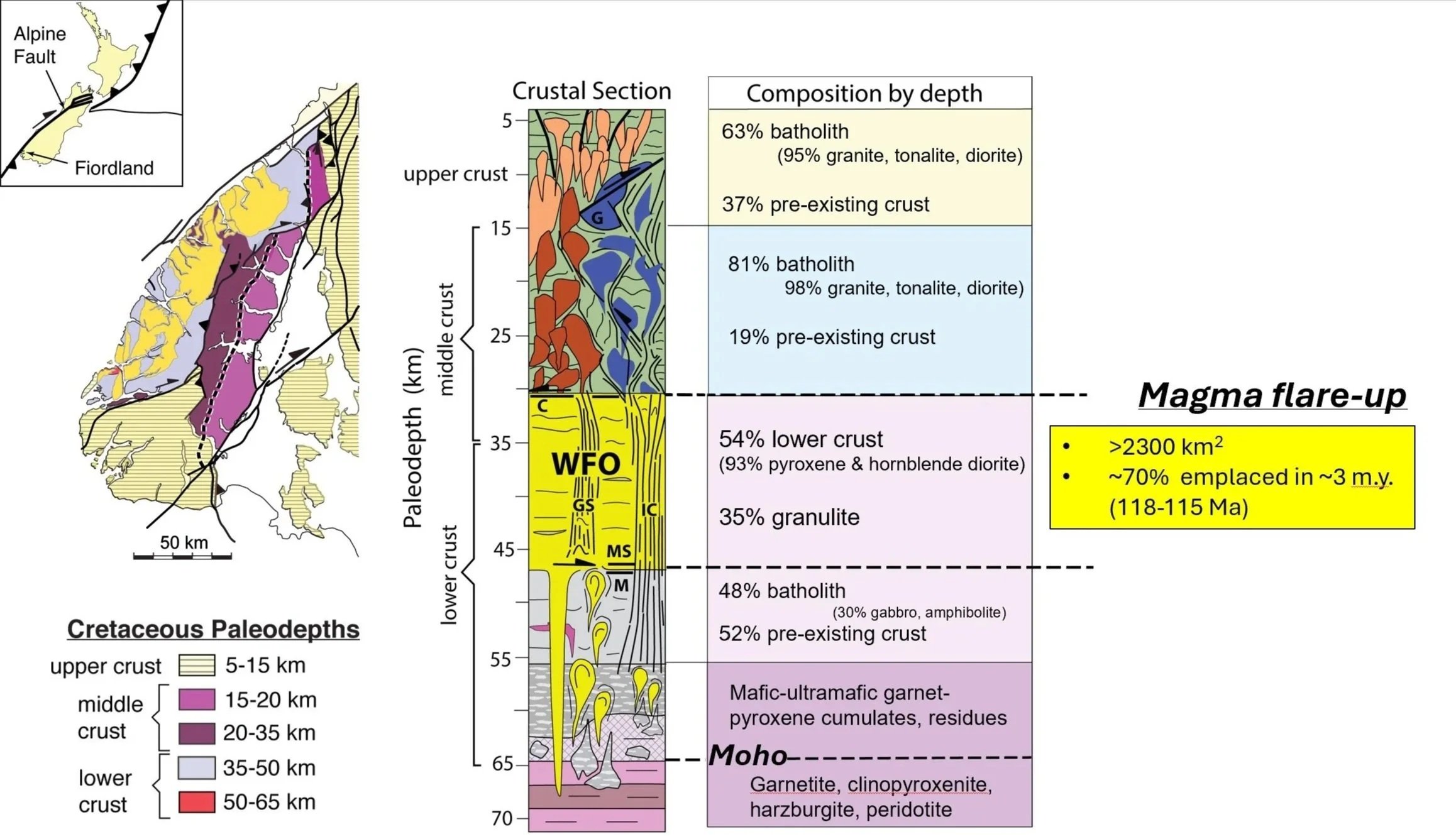 Reconstructing the crustal section of the Southern Fiordland magmatic arc. The map on the left shows Fiordland shaded by its depth during the Cretaceous. The deepest exposures are on the west side, shaded in purple and yellow. The crustal section in the center is a diagrammatic representation of the structure and is annotated at right with its composition, showing that the crust becomes Increasingly mafic with depth. The upper crust (above 30 km) is mainly granite, tonalite, and diorite forming bulbous and/or steep-sided bodies. Below 30-km depth, there are layered sheets. In the middle crust is the Western Fiordland Orthogneiss (WFO), which is a major part of the Median batholith. The Misty pluton, which Klepeis mentions in the podcast, is a part of the WFO. This section represents a major magma flare-up, covering about 2,300 sq km, of which 70 percent was emplaced in just 3 million years.