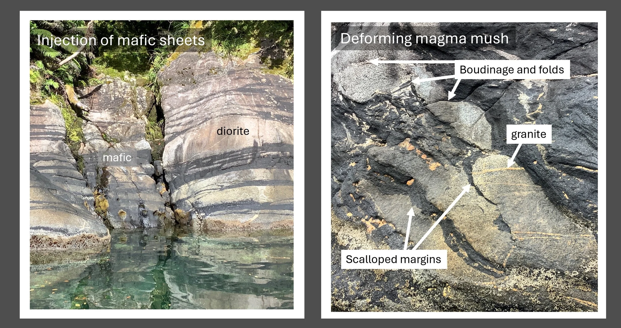 This outcrop shows mobilized granitic melts and mafic layers that have been pulled apart during deformation. Prior to the deformation, the dark material formed discrete layers, like those shown in the previous photo. The deformation shows that the different magma types were moving together as interacting mushes within the lower crust. Even more clearly than in the previous image, the granite cuts across both the mafic and dioritic units, further indicating that the granites were mobilized after the mafic dykes intruded the dioritic mush. As with the previous image, this supports the idea that sequences of mafic and dioritic intrusions help mobilize and move granite melts.