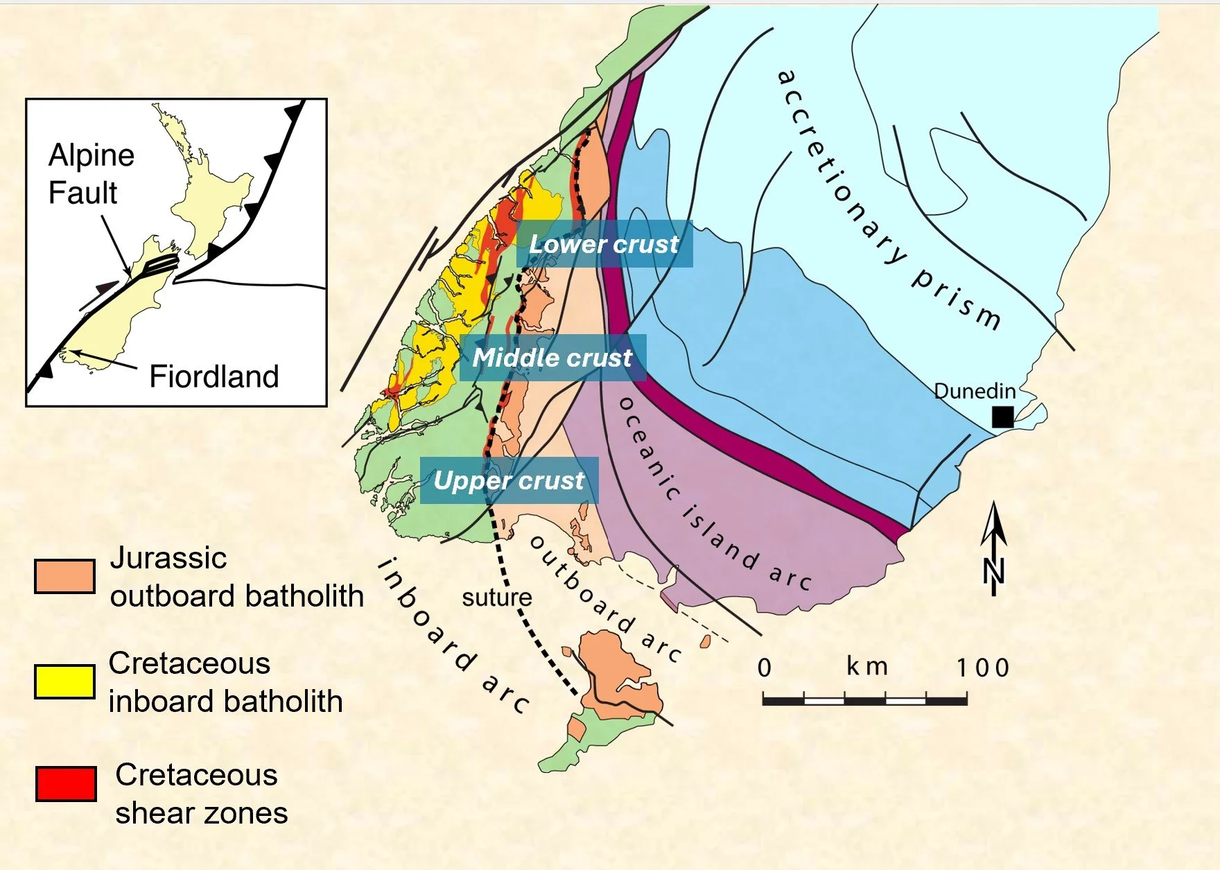 Geological map of Southern Fiordland. The map labels the lower, middle, and upper crustal regions that are all exposed thanks to tilting caused by compressional faulting along the Alpine Fault (black line running along the western coast). This unique geometry enabled Klepeis and his team to map the 3-dimensional structure of the crust and reveal the conduit and mushroom-like sheet structure of the intruding magma.