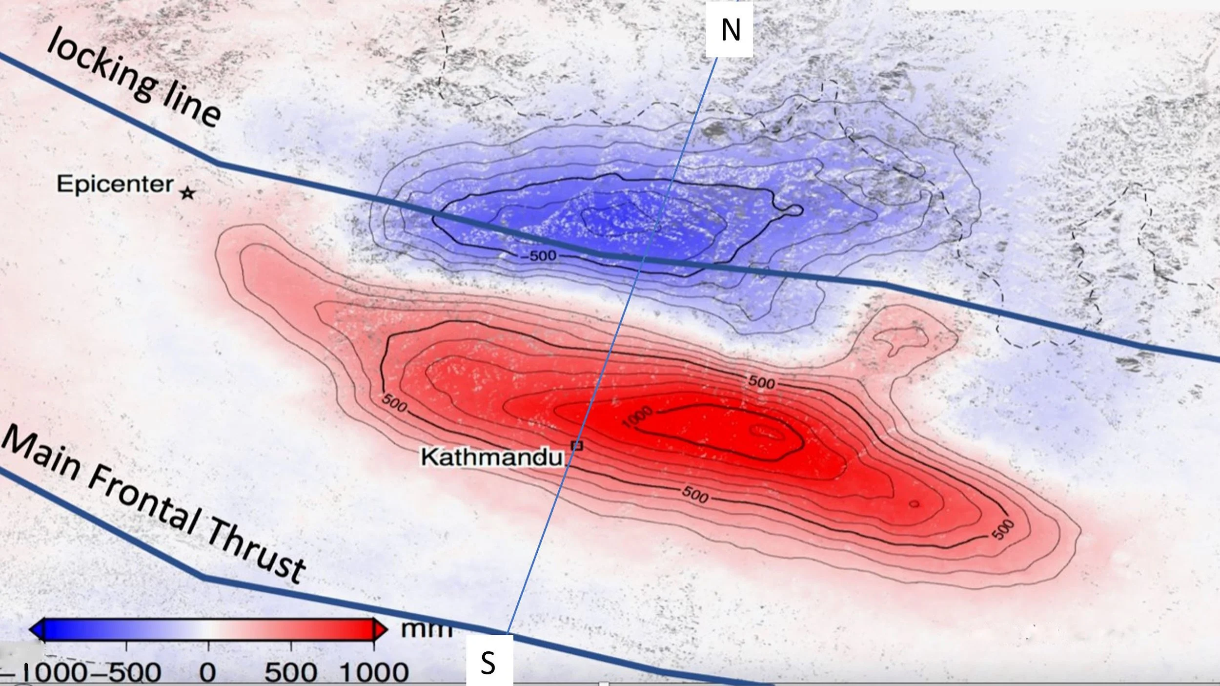 This image shows the depression (blue) of the mountains along the locking line and the uplift of the mountains near Kathmandu (red) over a 2-week period spanning the 2015 Gorkha earthquake in Nepal. The image is an interferogram created by comparing synthetic aperture radar captured during two passes of the ALOS-2 satellite over the region — one before the earthquake and one after. The depicted changes were imposed in less than one minute during the earthquake.