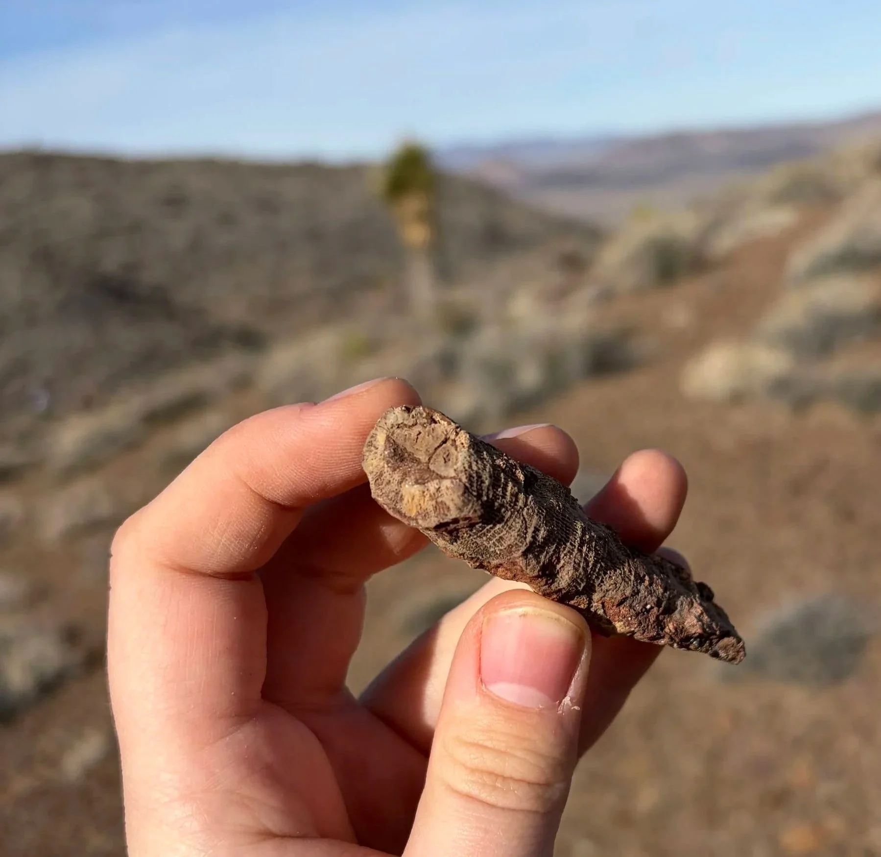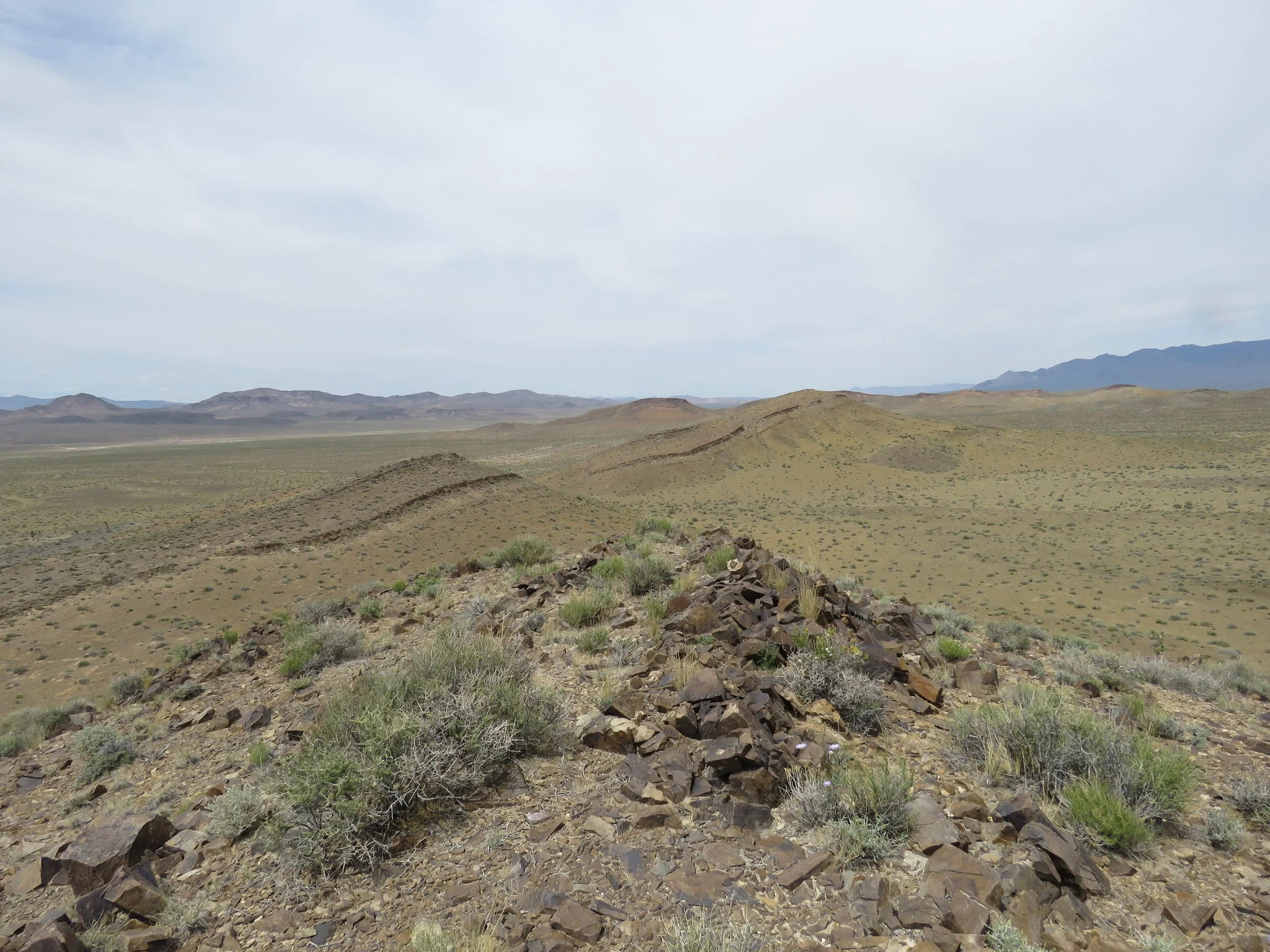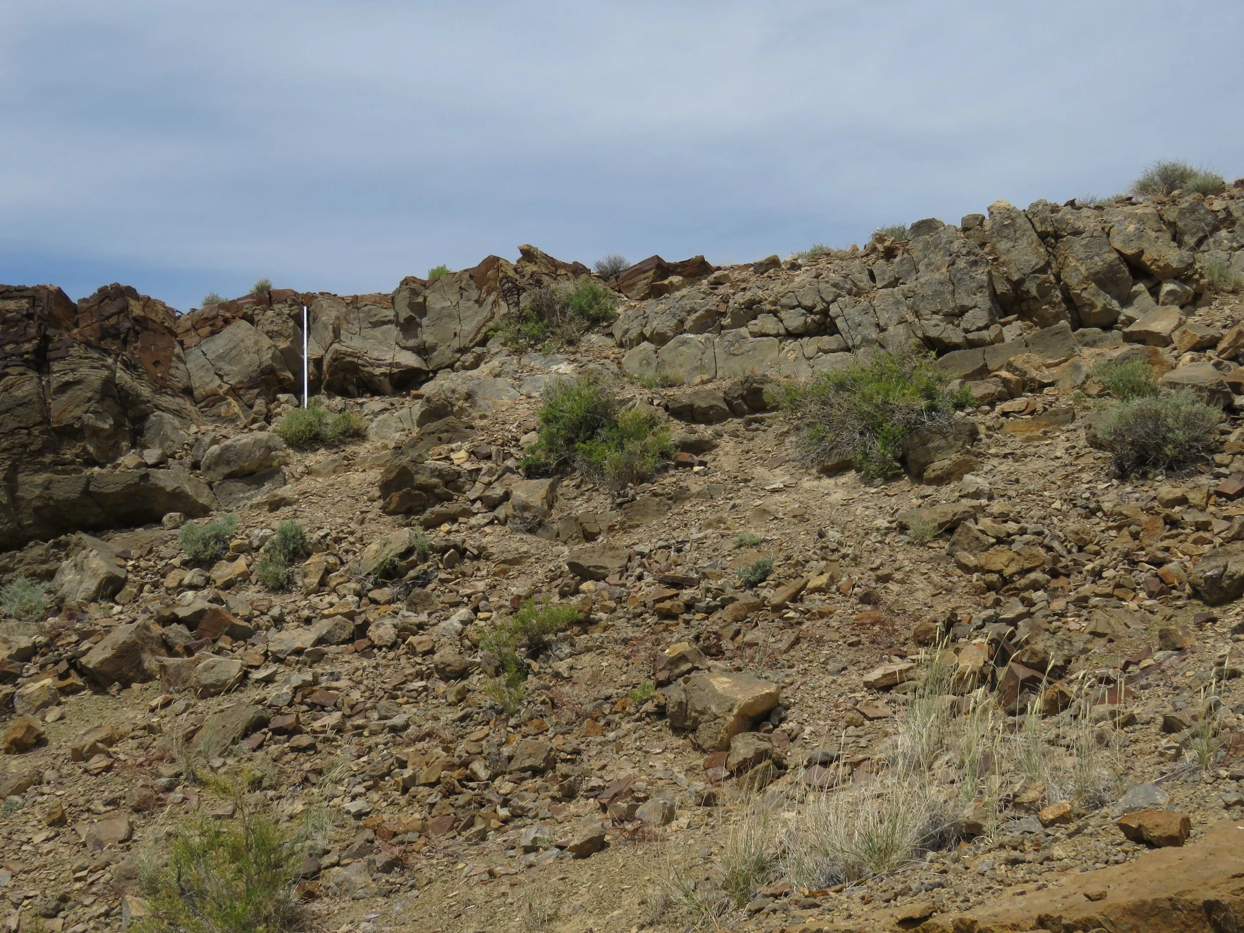 The upper Harkless Formation and the archaeocyath reefs in southern Nevada. In the foreground is sandstone that overlies the archaeocyath reef beds. In the background, the ridges on the hills represent the archaeocyath reef horizon and overlying siliciclastic beds.