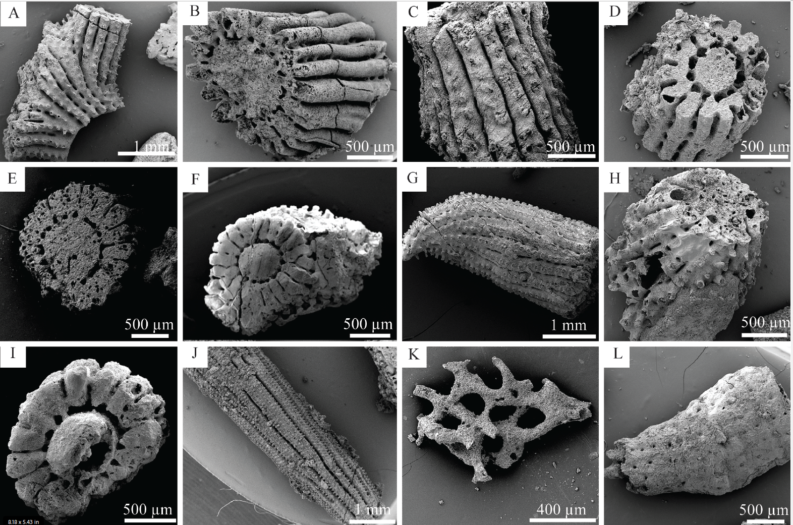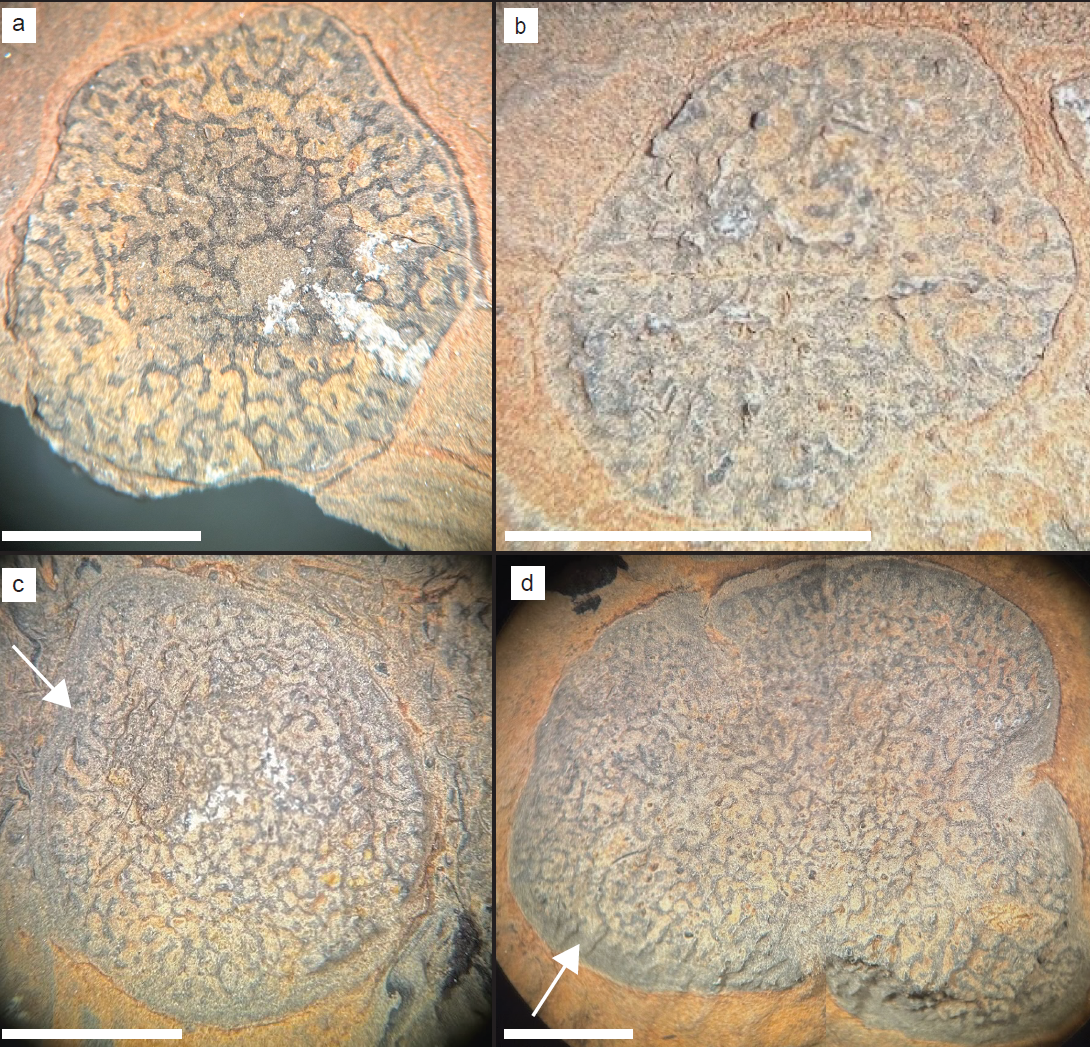 a, b: Archaeocyaths from the Carrara Formation and Mule Springs Formation in the western United states. These are the last known occurrences of archaeocyaths in the western United States. c: Archaecyaths with a microbial coating that was made into the thin sections shown above right in c and d. d: the largest archaeocyath from the Carrara formation. White arrows show microbial coatings forming around archaeocyaths. All scale bars are 5 mm.