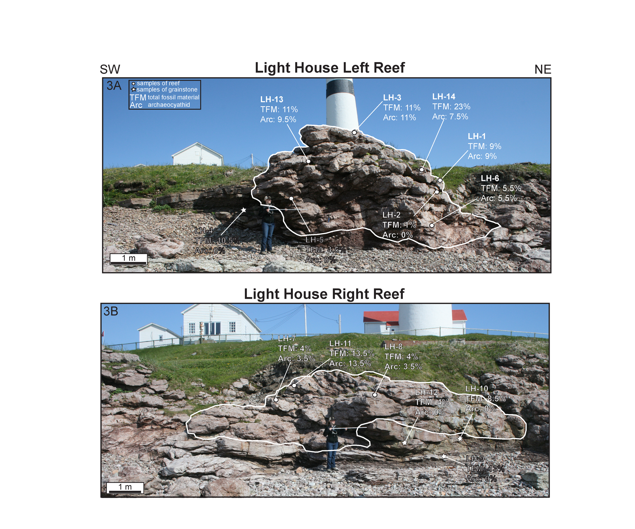 Archaeocyath patch reefs on the southern coast of Labrador near Forteau. These are exposed along the sea cliffs, and Pruss and her team sampled the reefs and surrounding beds to determine how much skeletal mass was present within and around the reefs. TFM is the percentage of total fossil material counted in thin section, and archaeo represents the amount of skeletal material that is comprised of archaeocyaths. Notably, some beds outside the reef mounds themselves have high skeletal abundance without any archaeocyaths, for example F-LH-9-9, TFM: 9.5%, 0% Archaeo. Here, many of the animals living on and around the reefs would have been trilobites and echinoderms.