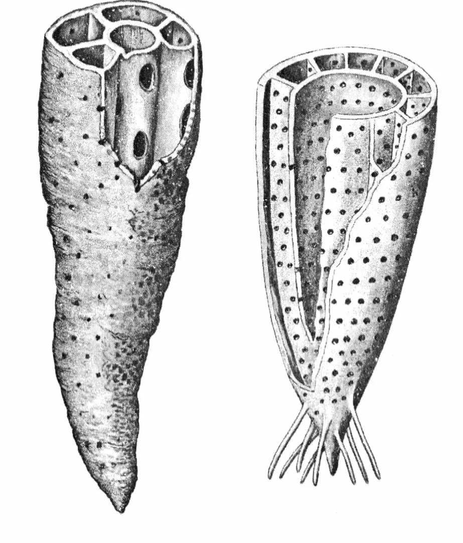 Sketch of form and structure of achaeocyaths. Archaeocyatha were sessile, filter-feeding, calcareous, sponge-like organisms, characterized by a conical, vase-shaped, or cylindrical skeleton. Their structure consisted of two porous, nested calcite cones (inner and outer walls) separated by a space called the intervallum, which contained vertical plates (septa, taeniae) or horizontal plates (tabulae). Root-like structures at the bottom (holdfast) secured them in place.