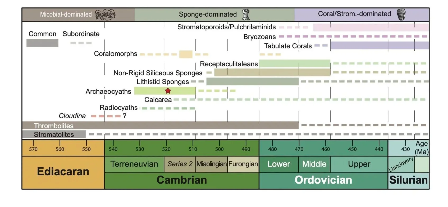 Primary reef builders during the Neoproterozoic (Ediacaran) and early Paleozoic (Cambrian, Ordovician, and Silurian). The Neoproterozoic is primarily dominated by microbial organisms including the stromatolites (see Geology Bites episode with Martin Van Kranendonk). The Cambrian is dominated by a variety of sponge organisms including the archaeocyaths. In the Ordovician and Silurian, coral and stromatoporoid species became the dominant reef builders. The red star denotes the approximate interval of the Mongolian reefs where some of the best-preserved archaeocyath reefs are found.