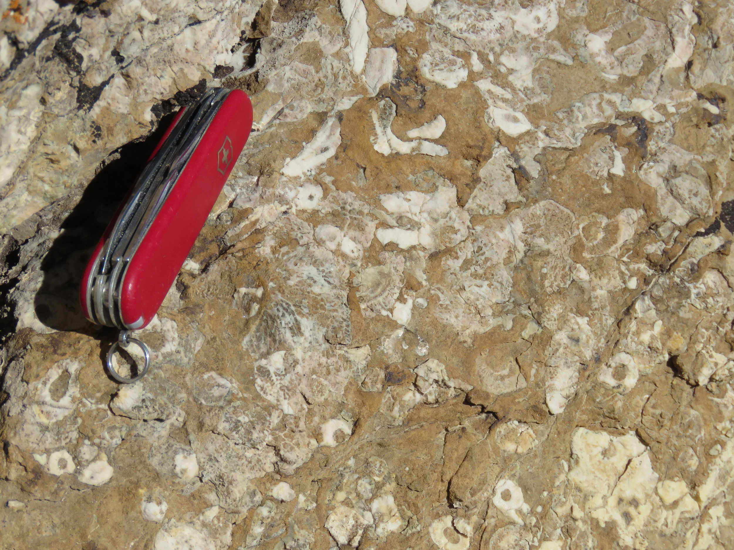 In this closeup of an upper Harkless Formation archaeocyath reef, the cup architecture of the archaeocyath skeleton can be seen, mostly as cross-sections of cones.