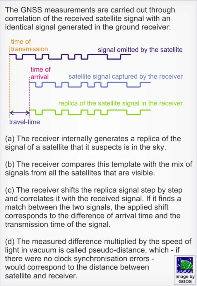 Principle of satellite-based position measurement. The distances are referred to pseudo-distances as they include errors from clock differences and atmospheric delays.